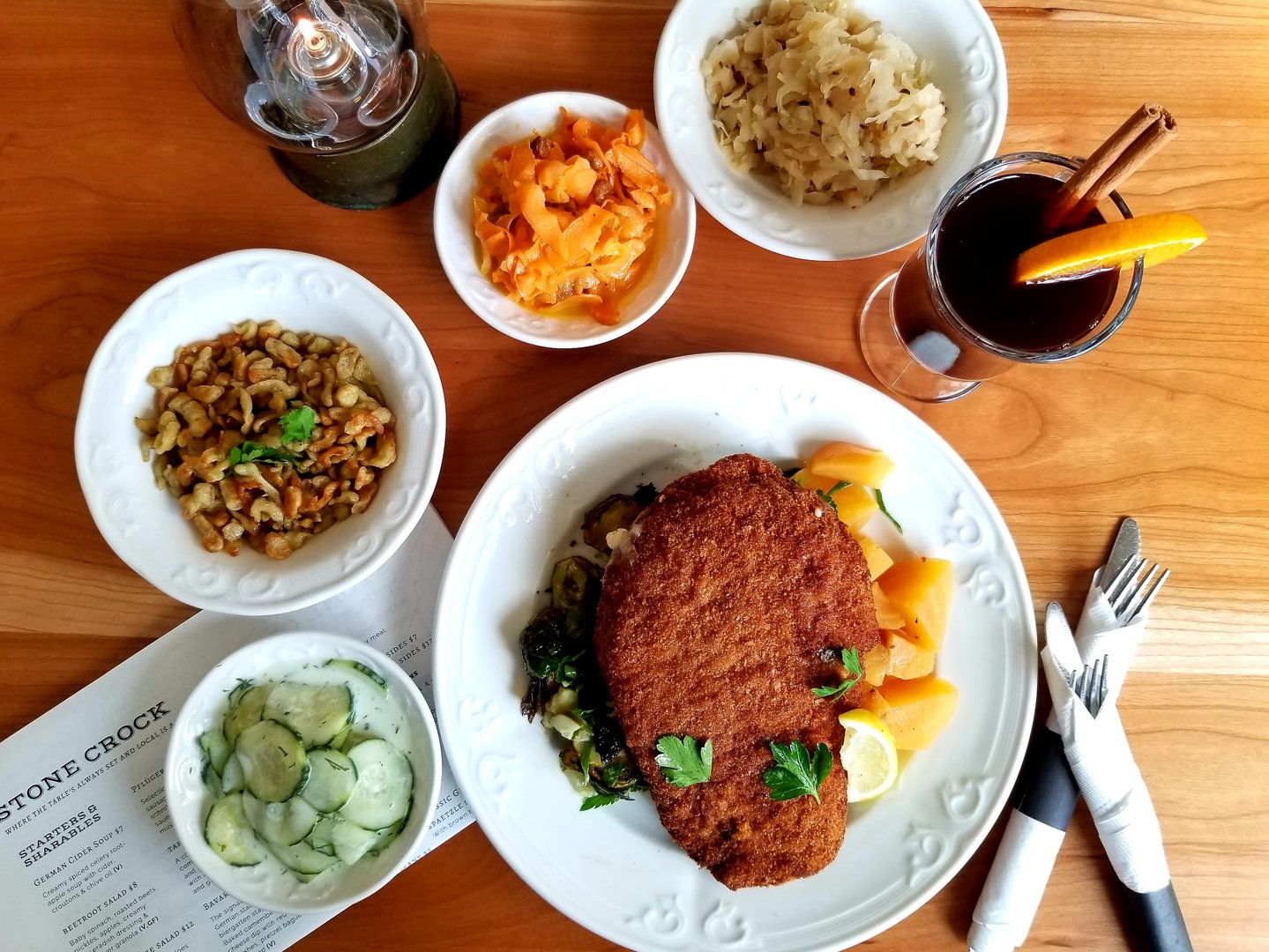 Traditionally prepared pork and fried crisp! Vegetarian option (V): Crispy breaded celery root cutlets.